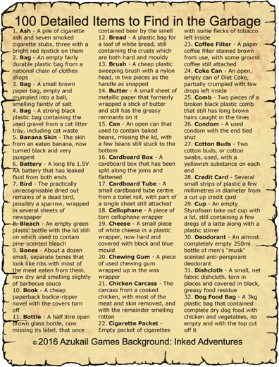 This is a modern list of 100 detailed, and frequently disgusting, items that players could come across when rooting through the garbage.