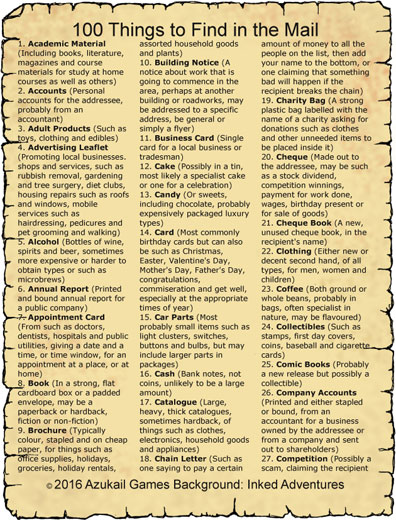 100 Things to Find in the Mail is now available to buy from DriveThruRPG and RPGNow.