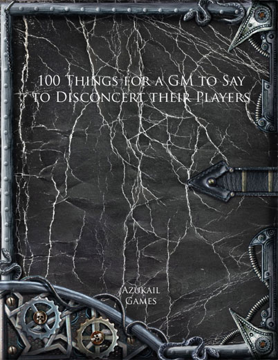 100 Things for a GM to Say to Disconcert their Players is a supplement containing things to say to make players worried or second guess their actions. These should not be overused, as doing so risks spoiling the game, but the occasional one should not do any harm.