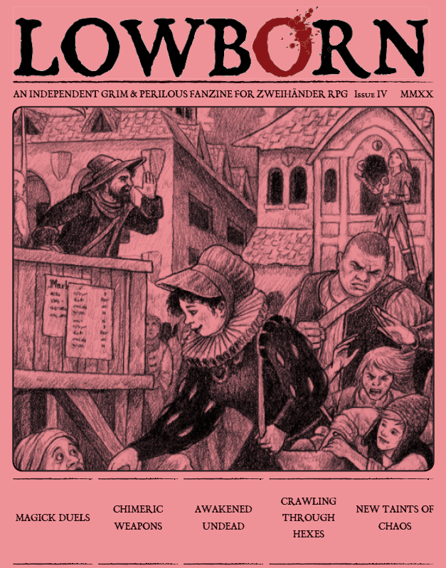 Lowborn #4 is the fourth edition of the fanzine published through the Grim & Perilous Library Community Content Programmes. It contains articles and adventures for ZWEIHÄNDER and we have contributed to it. The fanzine is available in both PDF and print on demand, with the PDF coming free with the print on demand version.