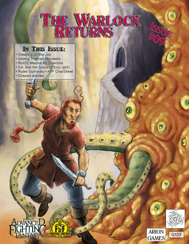 This is a fanzine for Advanced Fighting Fantasy that contains a variety of articles. It isn’t published by us, but by Arion Games, but we have contributed content to it. It’s currently available as a PDF with print on demand to follow.