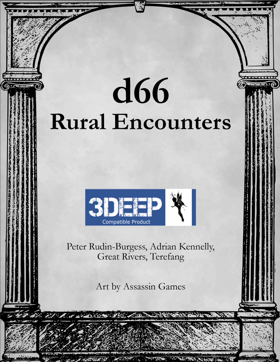 Ruins can be encountered and just because they are ruined doesn’t mean they are empty. 100 Things to Find in a Ruin (3Deep) has 100 things to encounter in a ruin, from signs of other creatures to magical effects. This is a conversion of the original supplement to 3Deep.