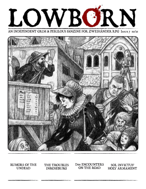 Lowborn #7 is the seventh edition of the fanzine published through the Grim & Perilous Library Community Content Programmes. It contains articles and adventures for ZWEIHÄNDER and we have contributed to it. The fanzine is available in both PDF and print on demand, with the PDF coming free with the print on demand version.