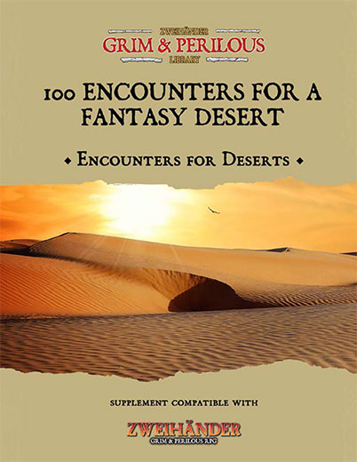 This supplement has 100 different encounters for a fantasy desert, with much inspiration taken from portrayals of Egyptian and Arabic deserts. There are places, people, creatures and things to encounter. Some may be potentially dangerous and other potentially beneficial. They can be used as a source of background colour or potential adventure hooks.