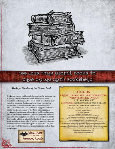 This supplement provides 100 low-value books that can be used to flesh out an Urth bookshelf. The books may have some small monetary value, but not much. Whether any of the information within a book is accurate or useful is up to the GM.