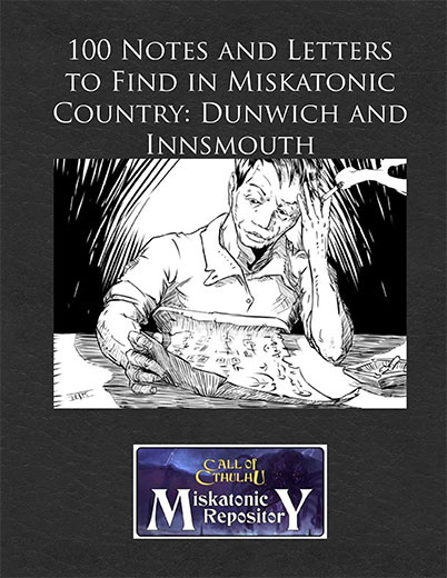 This supplement has 100 such notes and letters for them to find, all in or about Dunwich and Innsmouth. They can be used as a source of misinformation, oddities or perhaps adventure hooks.