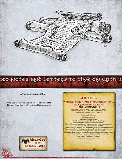 Characters may come across notes and letters when searching, in desks and drawers, on bodies or lying around somewhere. This supplement has 100 such that can be found on Urth and cover Caecras, Dis, Low Country, Old Edene, the Grand Duchy and the Kingdom of God.