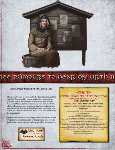 This is a collection of 100 different rumours that can be used with the official Urth setting for Shadow of the Demon Lord. These rumours can be discovered by characters who are asking around for information.