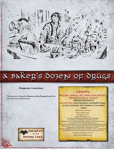 This supplement has 13 new drugs for Shadow of the Demon Lord. Most of the drugs have advantages for taking them, as well as disadvantages, but one is primarily intended to control others.