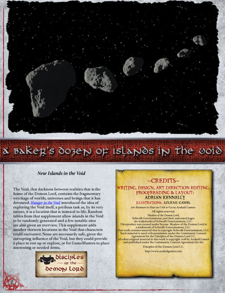The Hunger in the Void introduced the Void for Shadow of the Demon Lord, the place between universes where the Demon Lord dwells. The Void contains the wreckage of devoured universes that can be explored.
