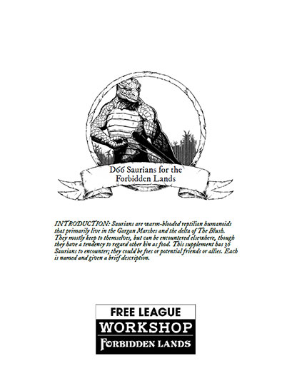 Saurians are warm blooded reptilian humanoids in the Forbidden Lands. This supplement has 36 saurians to encounter; they could be foes or potential friends or allies. Each is named and given a brief description.