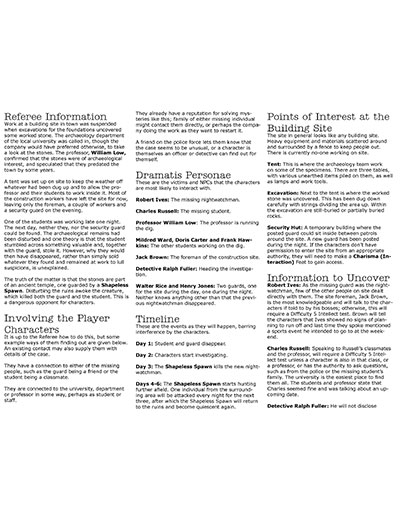 Spawn of the Temple is a short pamphlet adventure for Dark Streets & Darker Secrets. The adventure covers two sides of a sheet of paper and requires the characters to solve the disappearances from a building site where archaeological remains were found.