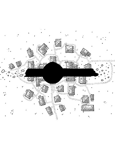 This is a hand drawn map of a small settlement next to a huge ruined wall. The art may be used in personal and commercial products, and can be modified in any way. It cannot be resold, even if modified, as stock art or part of another stock art pack. Attribution is required in commercial products for this piece.