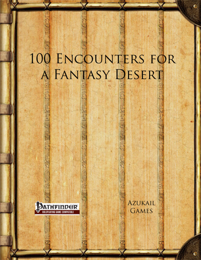 This supplement has 100 different encounters for a fantasy desert, with much inspiration taken from portrayals of Egyptian and Arabic deserts. There are places, people, creatures and things to encounter. Some may be potentially dangerous and other potentially beneficial. They can be used as a source of background colour or potential adventure hooks.