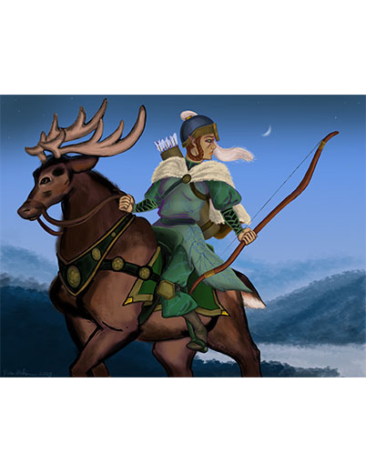 This is a landscape US Letter size hand drawn image of a half-elven mercenary riding a stag.