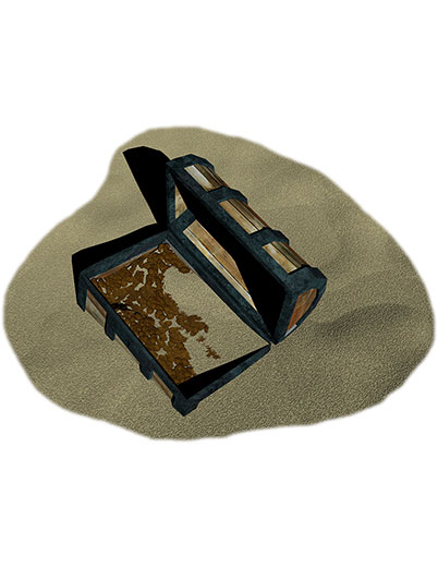 This is a piece of colour filler art showing an open chest of gold coins partially buried in the sand.