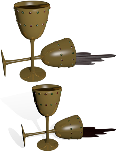 This is a piece of colour filler art with two gem-studded gold goblets, one vertical and one lying down in a puddle of liquid.