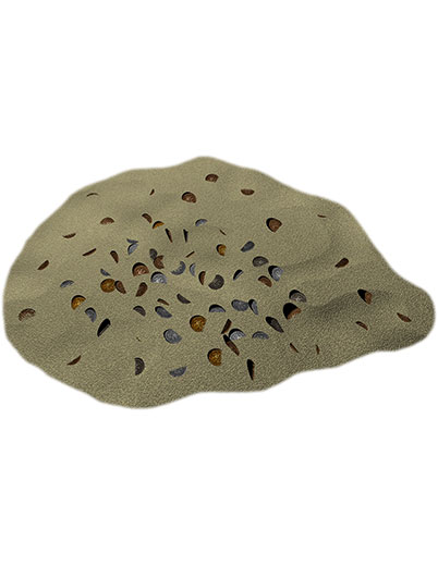 This is a piece of colour filler art showing platinum, gold, electrum, silver and copper coins partially buried in sand.