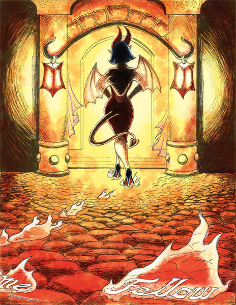 This is a US Letter size hand drawn image of a devilish courtesan walking towards an archway leaving flaming footprints.