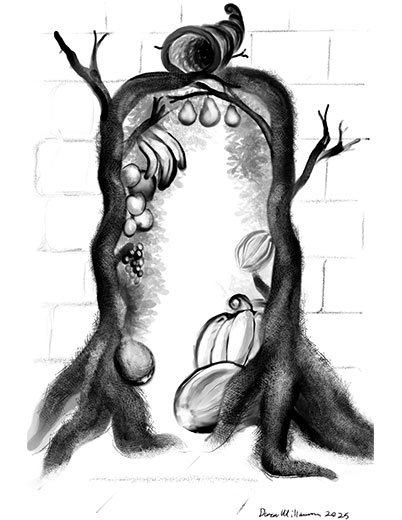 This is a piece of hand drawn filler art depicting a door bearing fruit.