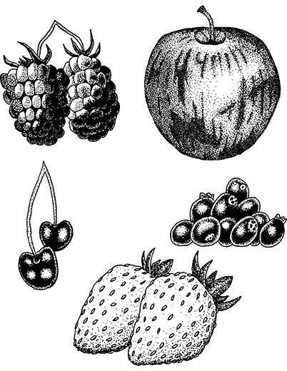 This is a collection of hand drawn filler art depicting five individual fruit, apple, blackberries, blueberries, cherries and strawberries.