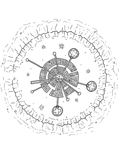 This is a hand drawn map of a moonbase built in a crater. The art may be used in personal and commercial products, and can be modified in any way. It cannot be resold, even if modified, as stock art or part of another stock art pack. Attribution is required in commercial products for this piece.