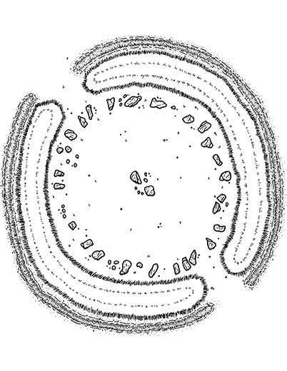 This is a hand drawn map of a stone circle surrounded by an earthen berm and ditch. The art may be used in personal and commercial products, and can be modified in any way. It cannot be resold, even if modified, as stock art or part of another stock art pack. Attribution is required in commercial products for this piece.