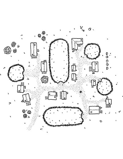 This is a hand drawn map of a small village nestled amongst barrow mounds. The art may be used in personal and commercial products, and can be modified in any way. It cannot be resold, even if modified, as stock art or part of another stock art pack. Attribution is required in commercial products for this piece.