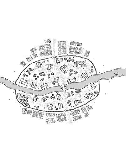 This is a hand drawn map of a small fortified village built on a river. The art may be used in personal and commercial products, and can be modified in any way. It cannot be resold, even if modified, as stock art or part of another stock art pack. Attribution is required in commercial products for this piece.
