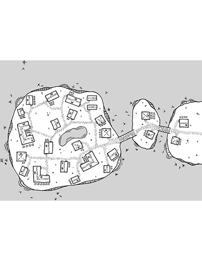 This is a hand drawn map of a small village on sea stacks. The art may be used in personal and commercial products, and can be modified in any way. It cannot be resold, even if modified, as stock art or part of another stock art pack. Attribution is required in commercial products for this piece.