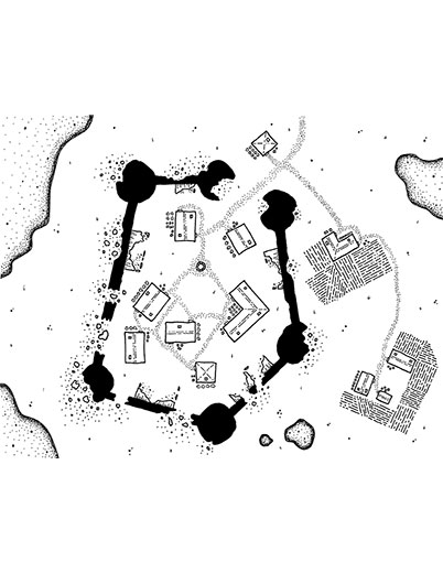 This is a hand drawn map of a small village inside a ruined castle. The art may be used in personal and commercial products, and can be modified in any way. It cannot be resold, even if modified, as stock art or part of another stock art pack. Attribution is required in commercial products for this piece.