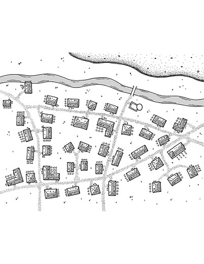 This is a hand drawn map of a small settlement by a river. The art may be used in personal and commercial products, and can be modified in any way. It cannot be resold, even if modified, as stock art or part of another stock art pack. Attribution is required in commercial products for this piece.