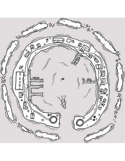 This is a hand drawn map of a small settlement built on an atoll. The art may be used in personal and commercial products, and can be modified in any way. It cannot be resold, even if modified, as stock art or part of another stock art pack. Attribution is required in commercial products for this piece.