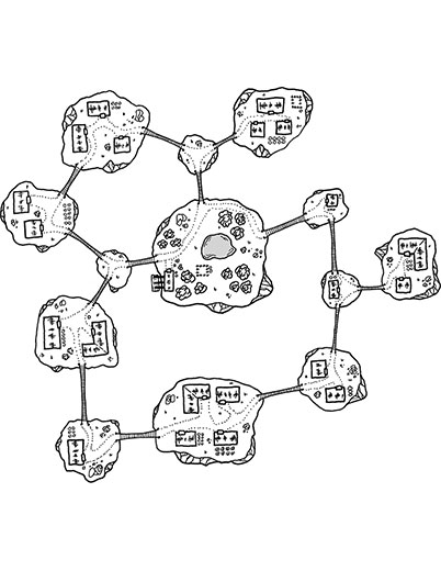This is a hand drawn map of a small settlement built on the top of several spires. The art may be used in personal and commercial products, and can be modified in any way. It cannot be resold, even if modified, as stock art or part of another stock art pack. Attribution is required in commercial products for this piece.