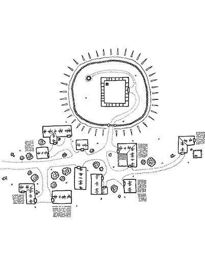 This is a hand drawn map of a small village built next to a castle. The art may be used in personal and commercial products, and can be modified in any way. It cannot be resold, even if modified, as stock art or part of another stock art pack. Attribution is required in commercial products for this piece.