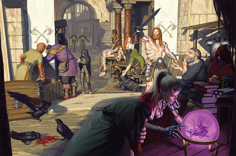 Two figures stepped into the circle from the northern end. They were a study in contrasts. One was broad-shouldered and tall, his thick nose scarred from being broken many times, and his long hair unkempt and knotted. The other was shorter, and slender, with an amused sneer on his face. The brute was pale, the other was dusky. The warrior wore steel and boiled leather, his companion painted silk and lambskin. The crowd began to whisper, eyes turning toward the pair of them. Oleg the Grinder had never lost a challenge laid down in the square, and given how easily his master Varian Kadrick took offense it was rare that a week passed that the musclebound enforcer didn’t settle at least one affair in the dueling ring.