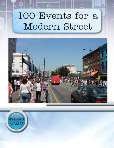 This is a list of 100 different events that players could encounter on a modern street. These can be used to as dressing, to hide more significant events or they may themselves be camouflage for something else.