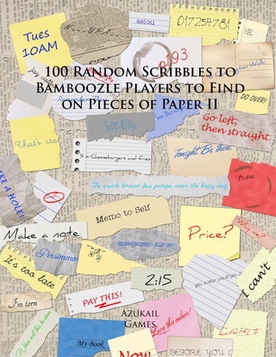Players will sometimes have their characters check paper for clues and 100 Random Scribbles to Bamboozle Players to Find on Pieces of Paper II has 100 irrelevant scribbles for them to find. These have no game relevance unless the GM decides otherwise.