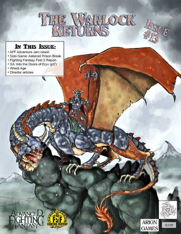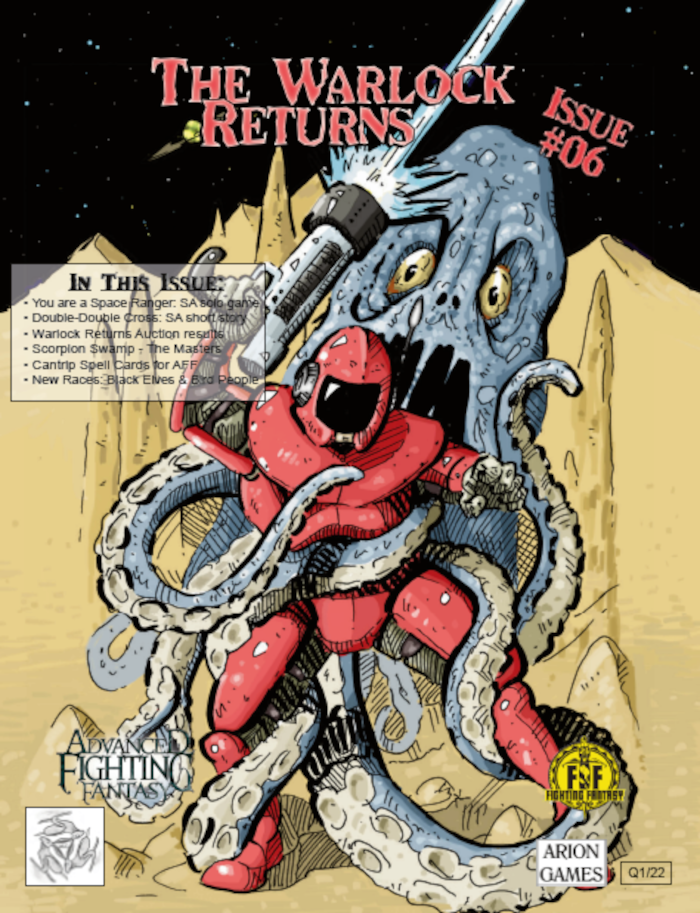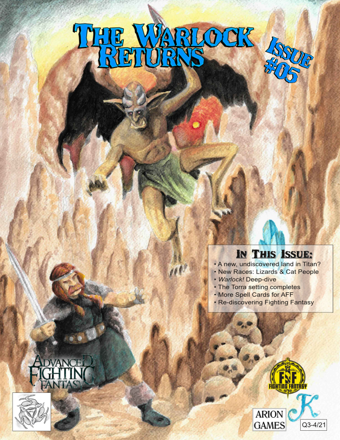 This is a fanzine for Advanced Fighting Fantasy that contains a variety of articles. It isn’t published by us, but by Arion Games, but we have contributed content to it. It’s currently available as a PDF with print on demand to follow.