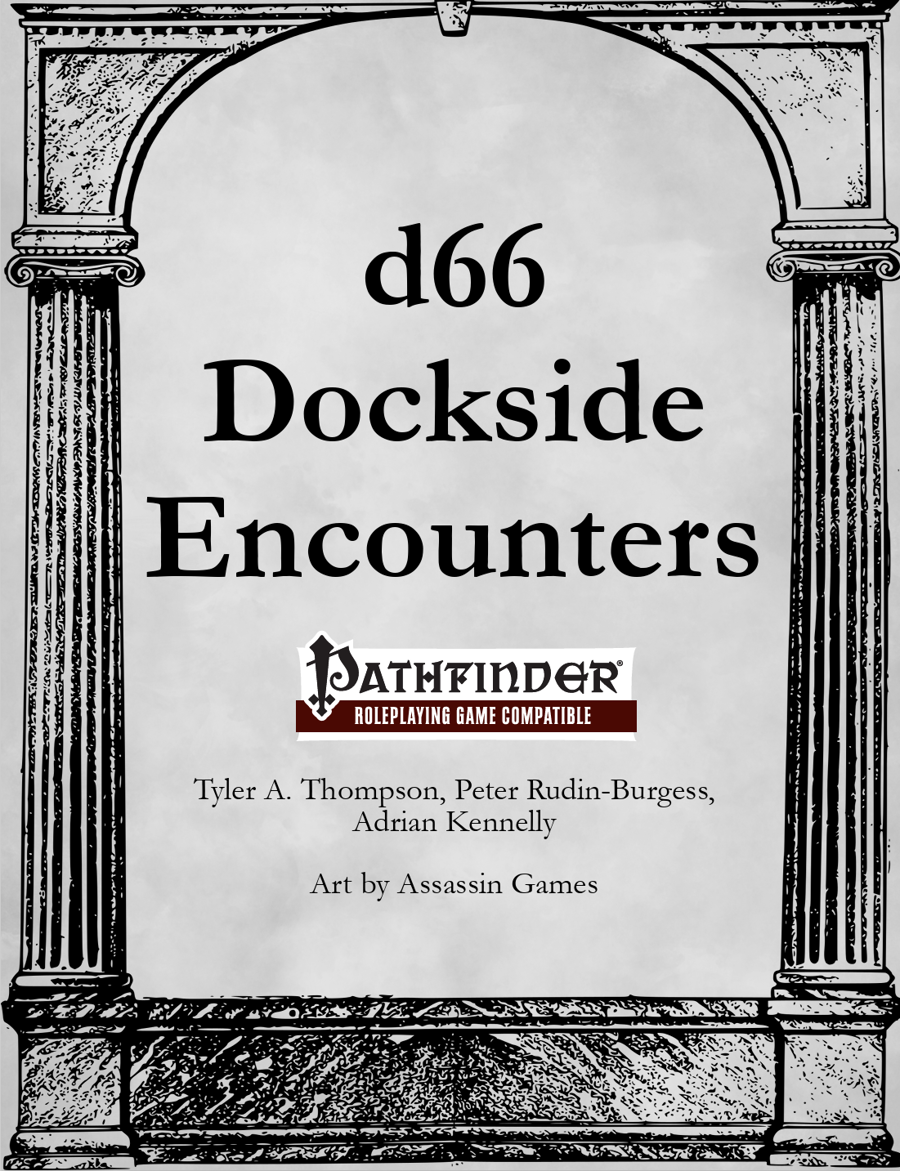 36 encounters a Party might find dockside or otherwise in and around port. Strange tentacles, harboring disputes, customs officials with a chip on their shoulder, shady crew recruiters, and much more. These encounters are adapt for and include appropriate rule references for PFRPG1e.