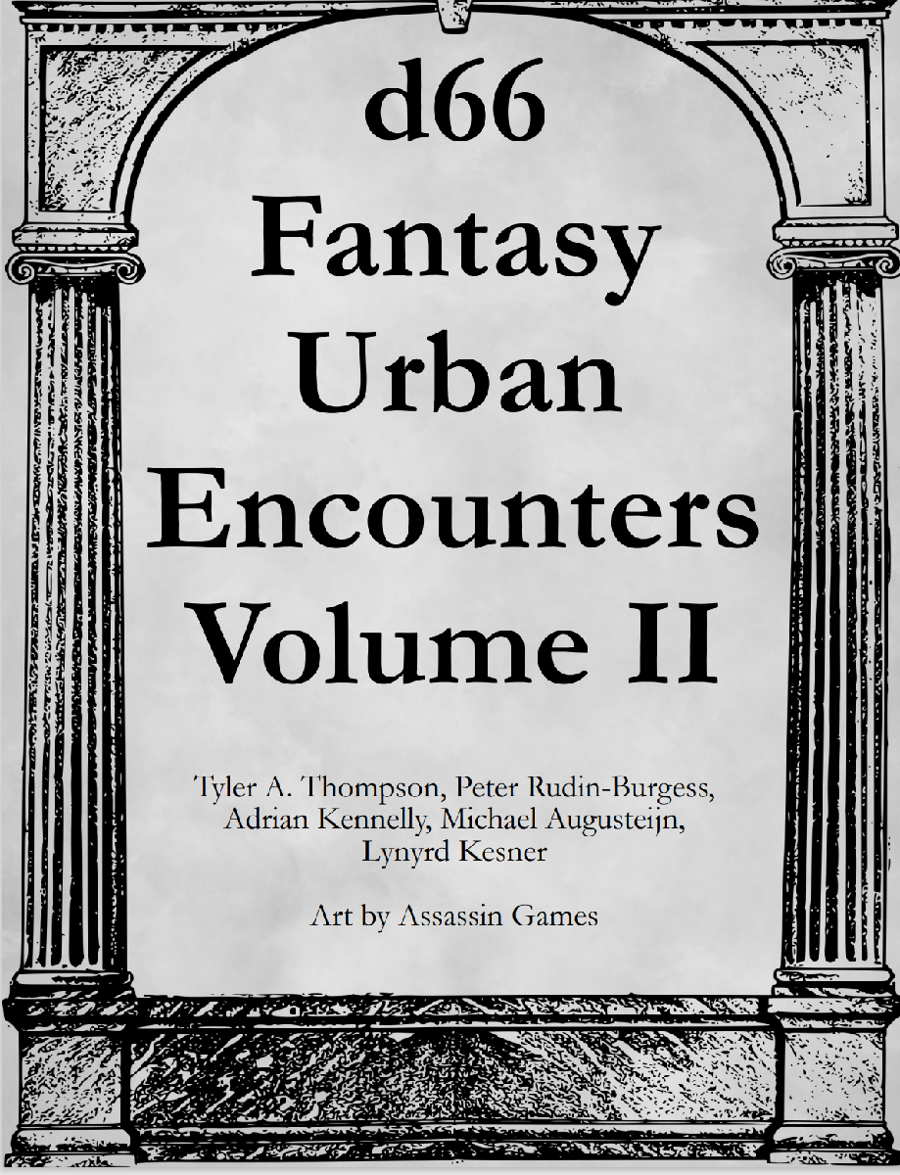 36 random events and encounters suitable for an urban environment in any fantasy campaign. Malicious and mysterious coin throwers, strange street murders, magically exploding buildings, and festivals gone awry, and much, much more.