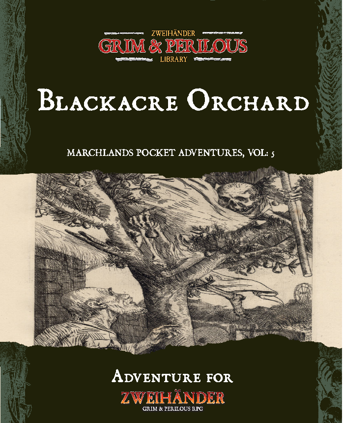 An estate improperly acquired, an orchard besieged by vengeful spirits and decay, a labyrinth of trees and a haunted house. Blackacre Orchard was once the producer of the finest apples and cider in the Marches, but no longer- now it lay abandoned, with foul beings prowling its tree rows and manor halls.